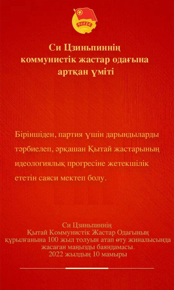 10 мамыр, онлайн ?Халы? Газет?? -- 10 мамыр к?н? та?ерте? Бейж??дег? Халы? ??рылтайы сарайында ?ытай Коммунист?к Жастар Ода?ыны? ??рыл?анына 100 жыл толу мерекес? салтанатты т?рде ?тт?. ?КП Орталы? комитет?н?? Бас Хатшысы, мемлекет Т?ра?асы ж?не Орталы? ?скери комитет т?ра?асы Си Цзиньпин жиналыс?а ?атысып, ма?ызды баяндама жасады.